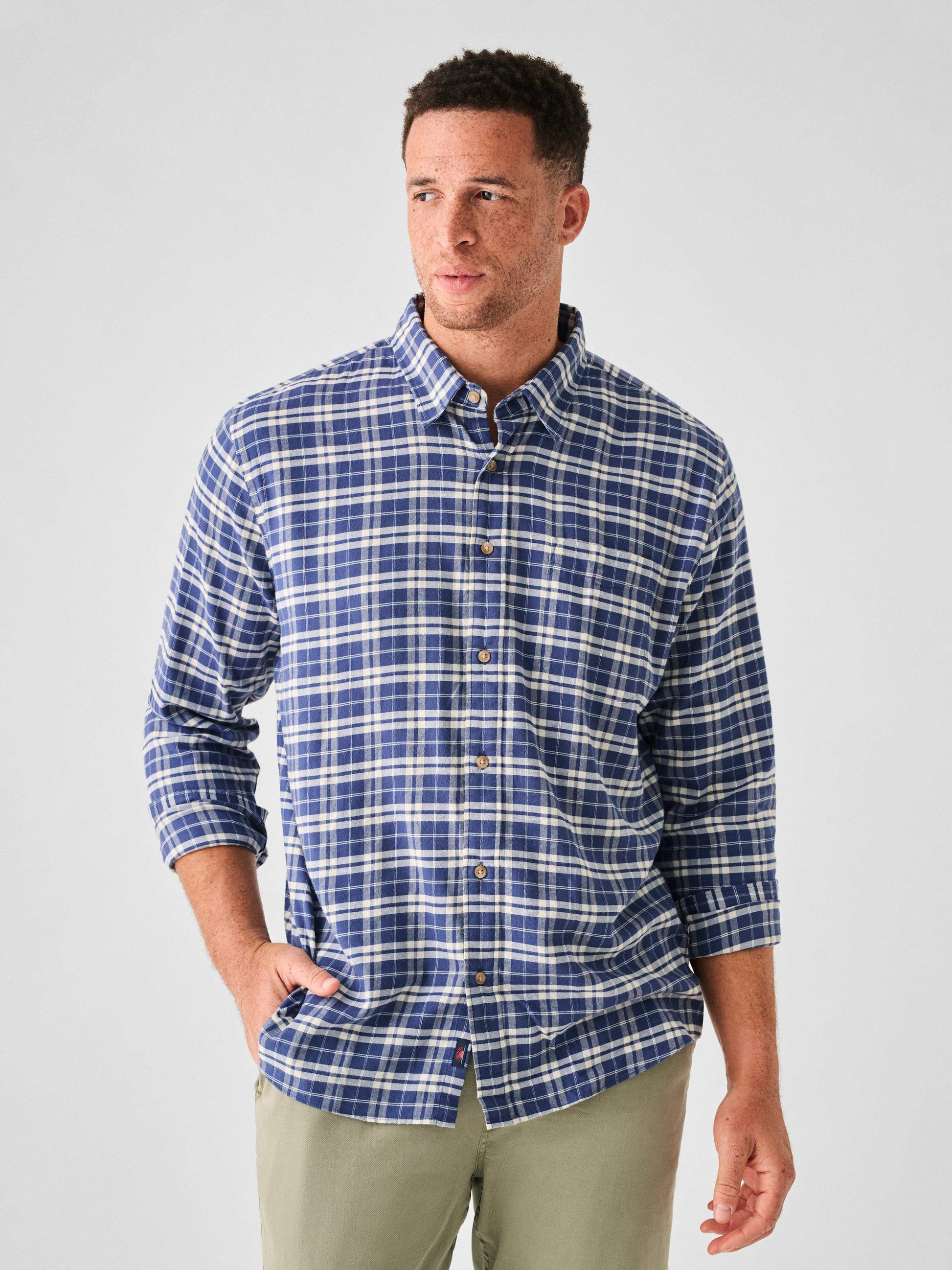 - Detail: Lightly brushed flannel. Button front and cuffs. Shirttail hem. Chest pocket on wearer's left