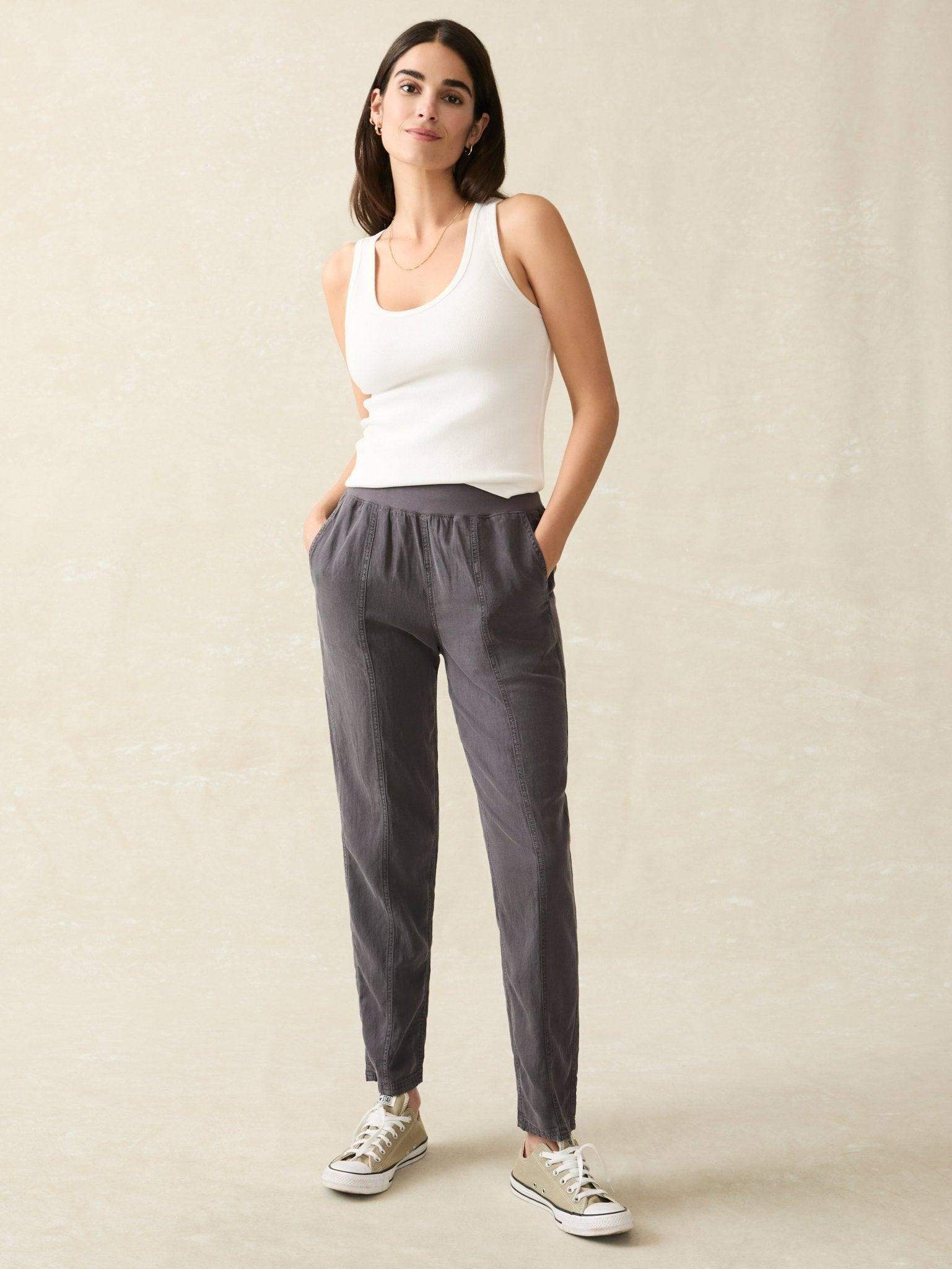 We took your tried-and-true Faherty favorite – the Arlie Pant, and finished it with front seams and a tapered leg for a more polished, streamlined look. Featuring the same soft, just-stretchy-enough blend of linen, cotton, and other fibers, it's then specially dyed and washed for a vintage-inspired, lived-in vibe. The pull-on waistband gives you all day comfort but it's elevated enough to wear to work or out to dinner.