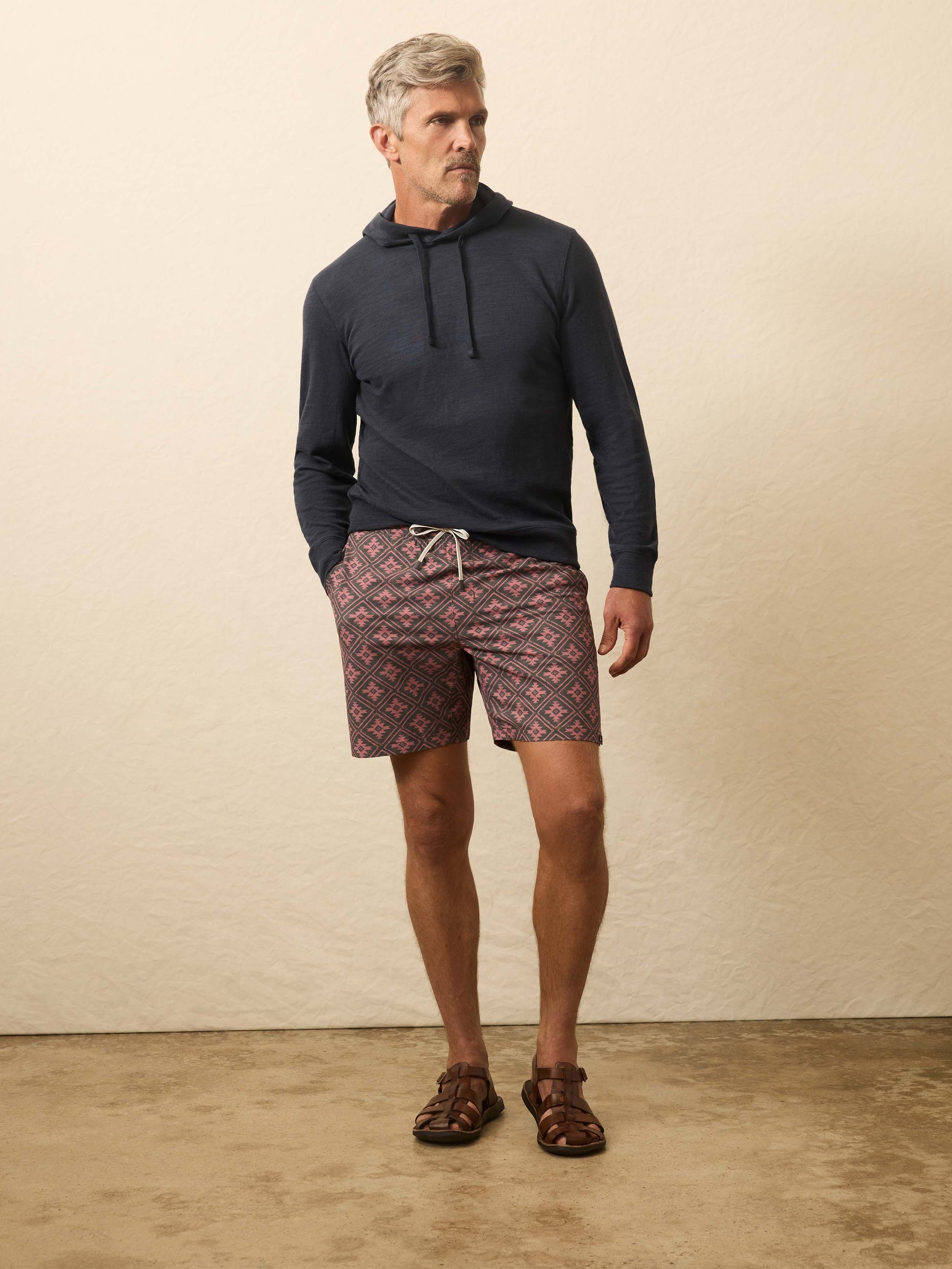 Native artist Doug Good Feather's (Standing Rock Lakota and Dakota Nation) rugged motif embellishes our most technical short yet for those gym-to-beach days (and maybe even some lounging in between). Packed with utility, it's got a breathable, compression liner for support during your most active moments and zippered accessory pockets to keep valuables close. The lightweight and quick-drying fabric has the perfect amount of stretch and offers UPF50+ so you can stay out and get after it. If you're looking for a true activewear short with an iconic Faherty beach vibe, this is it.