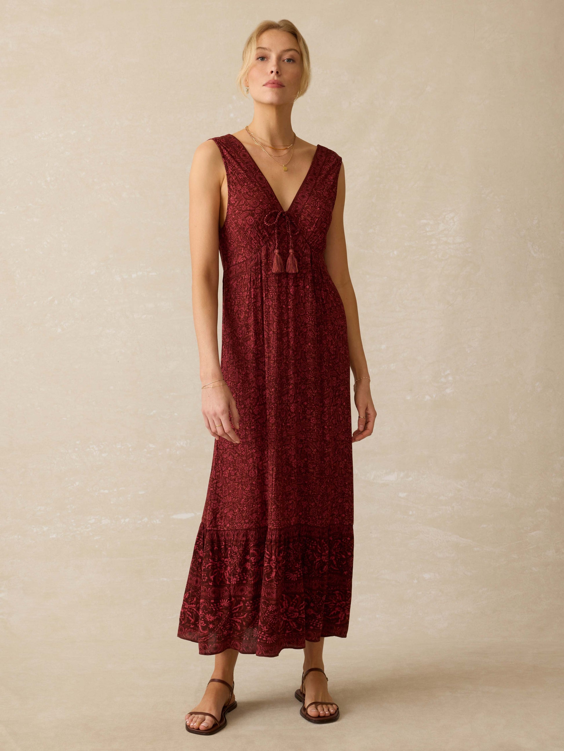 Feminine and free-spirited, this floral dress is a wardrobe dream for sunny days and special outings. Made from soft, lightweight viscose, it features a flattering V-neck at the front and back, accented with delicate drawcord ties and playful tassels for a touch of charm. The tiered skirt adds graceful movement with subtle shirring.