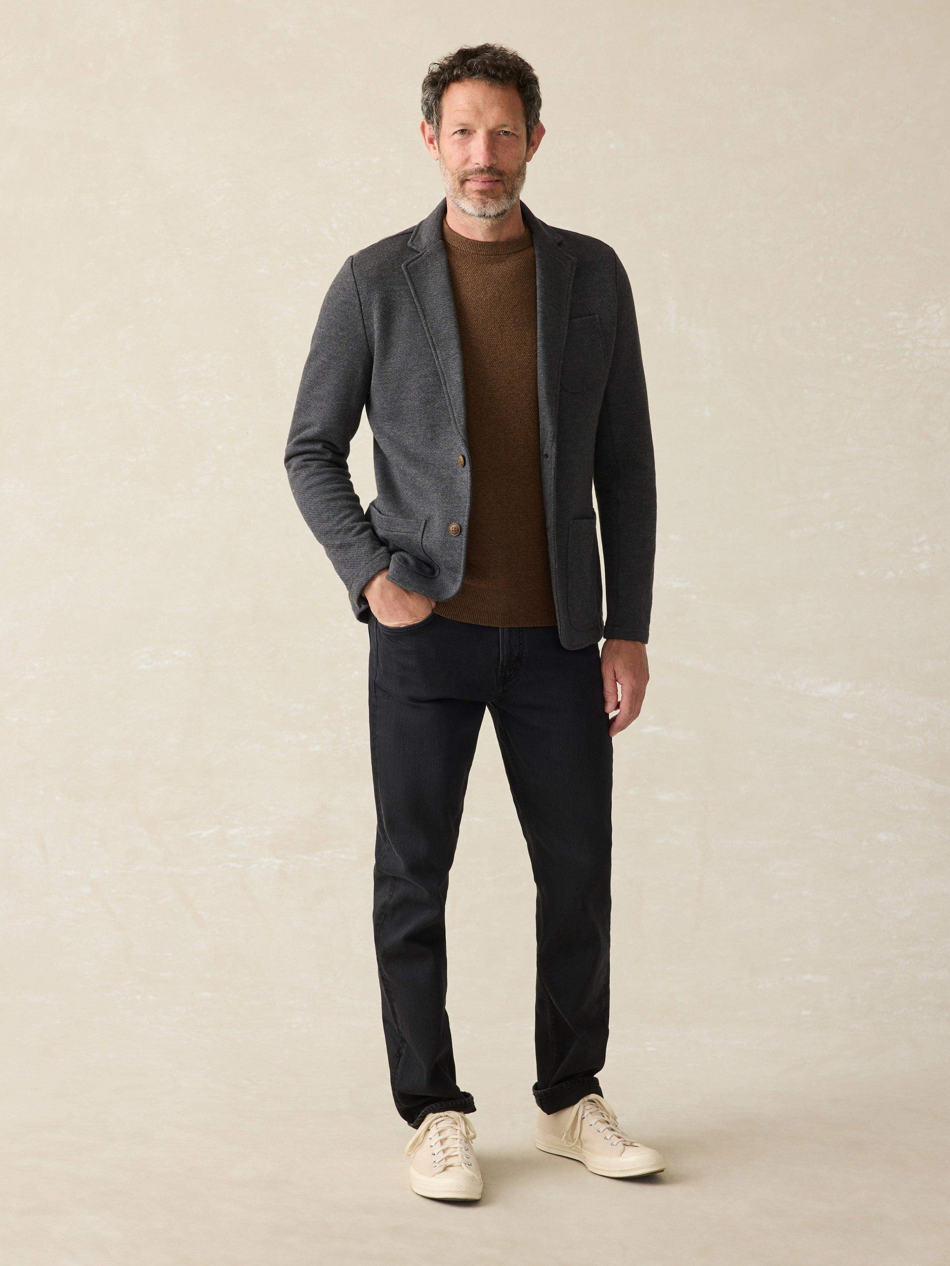 Our definitive sport coat leads with big-time comfort but is finished with top-shelf craftsmanship. The ultimate travel companion, it's easy to care for, making it the perfect piece to throw into your carry-on or wear right off the plane and into the boardroom. Elevated yet unstructured, the signature loopback knit fabric is ridiculously soft, and stretchy, while still retaining its shape. Meet the blazer especially made for guys who don't wear blazers.
