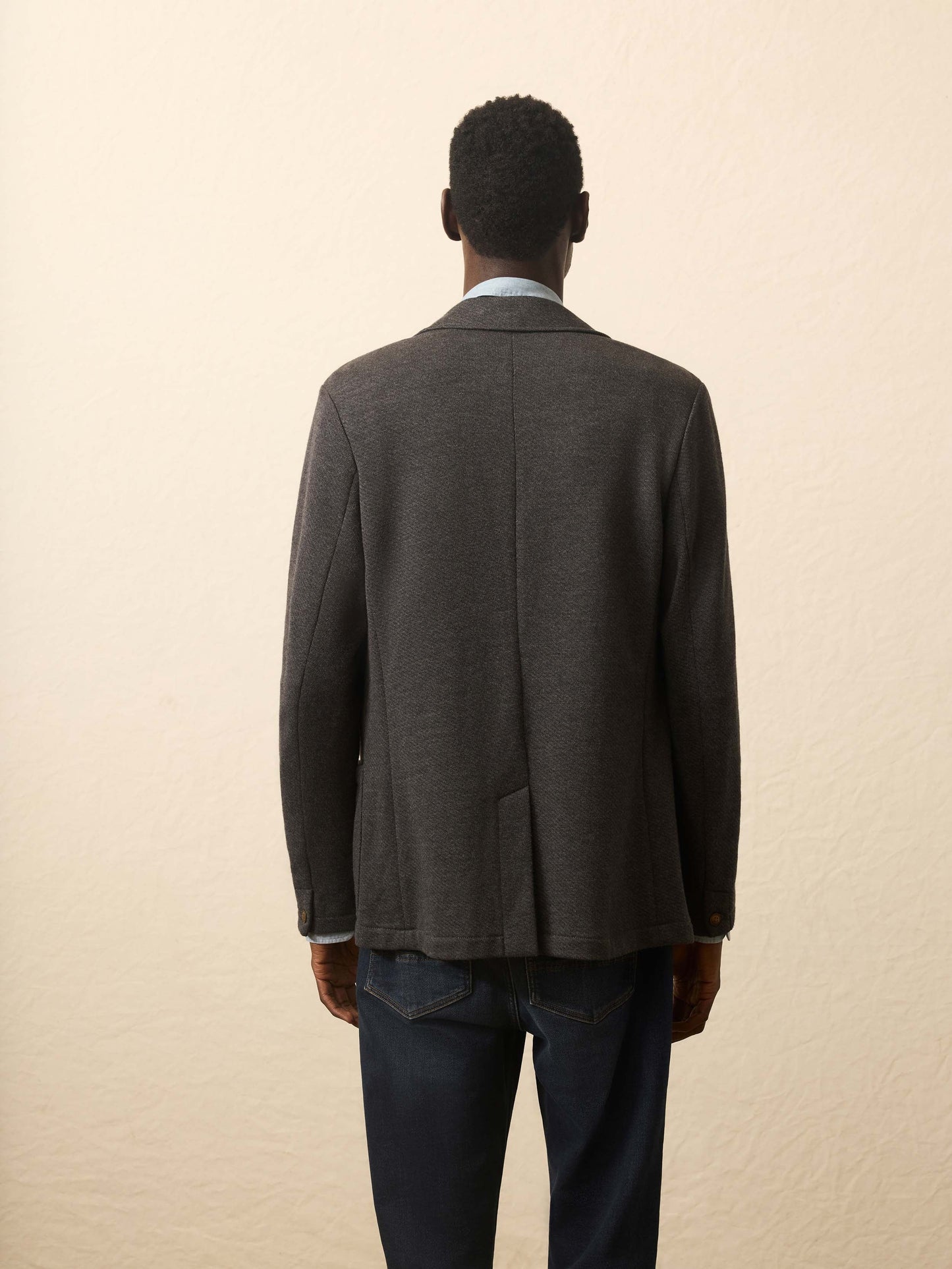 - Detail: Two-button blazer silhouette. Three exterior pockets. Two interior pockets. Unlined blazer construction. Jersey fabric at undercollar and internal bindings. Loop label at interior back neck.