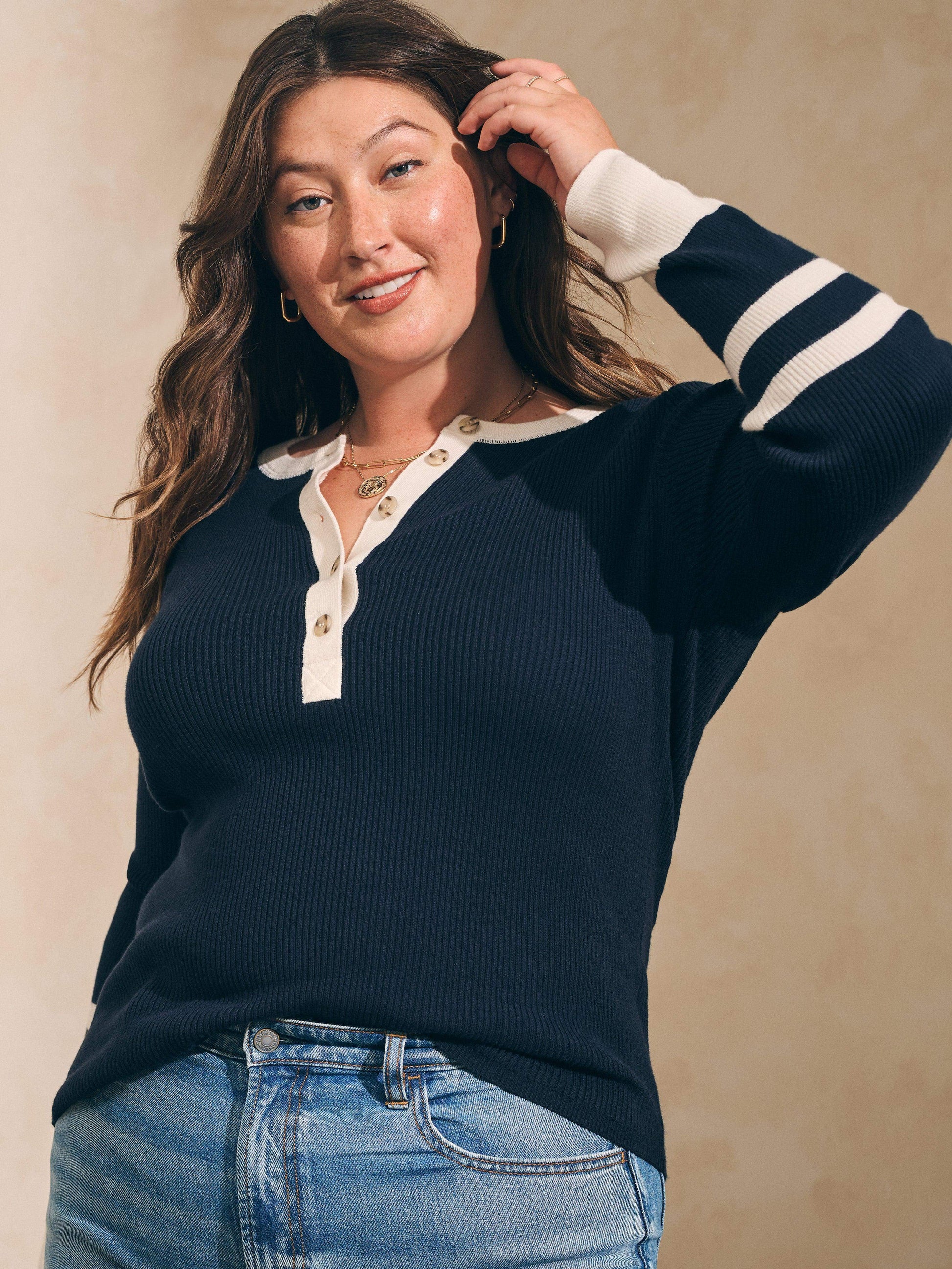 - Detail: Roundneck, five-button placket. Long sleeves with contrast cuffs.