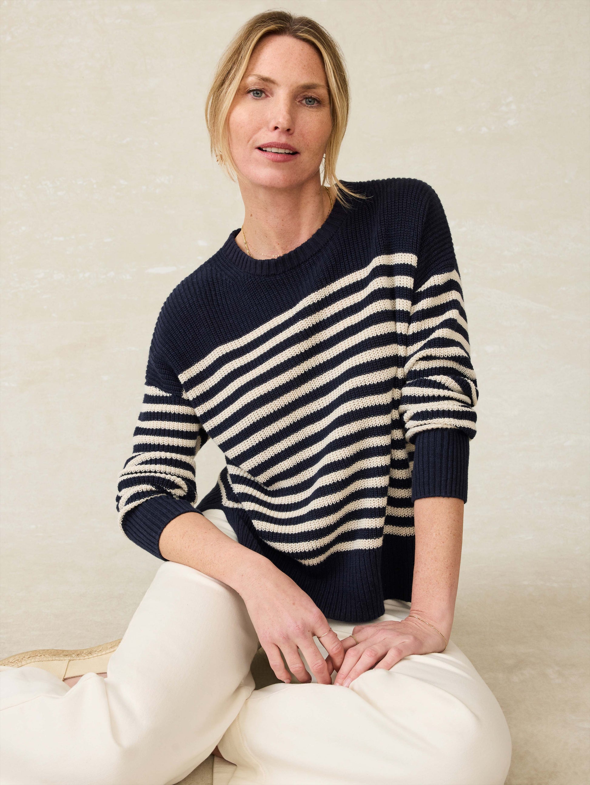 Warm enough for cool spring evenings but still light enough for sunny days, this charming crewneck is knit in an airy linen cotton blend that makes it the ideal in-between seasons sweater. The textural, open stitch drapes beautifully with a slouchy, slightly oversized fit. The definition of grace and ease, It's destined to become a well-worn staple.