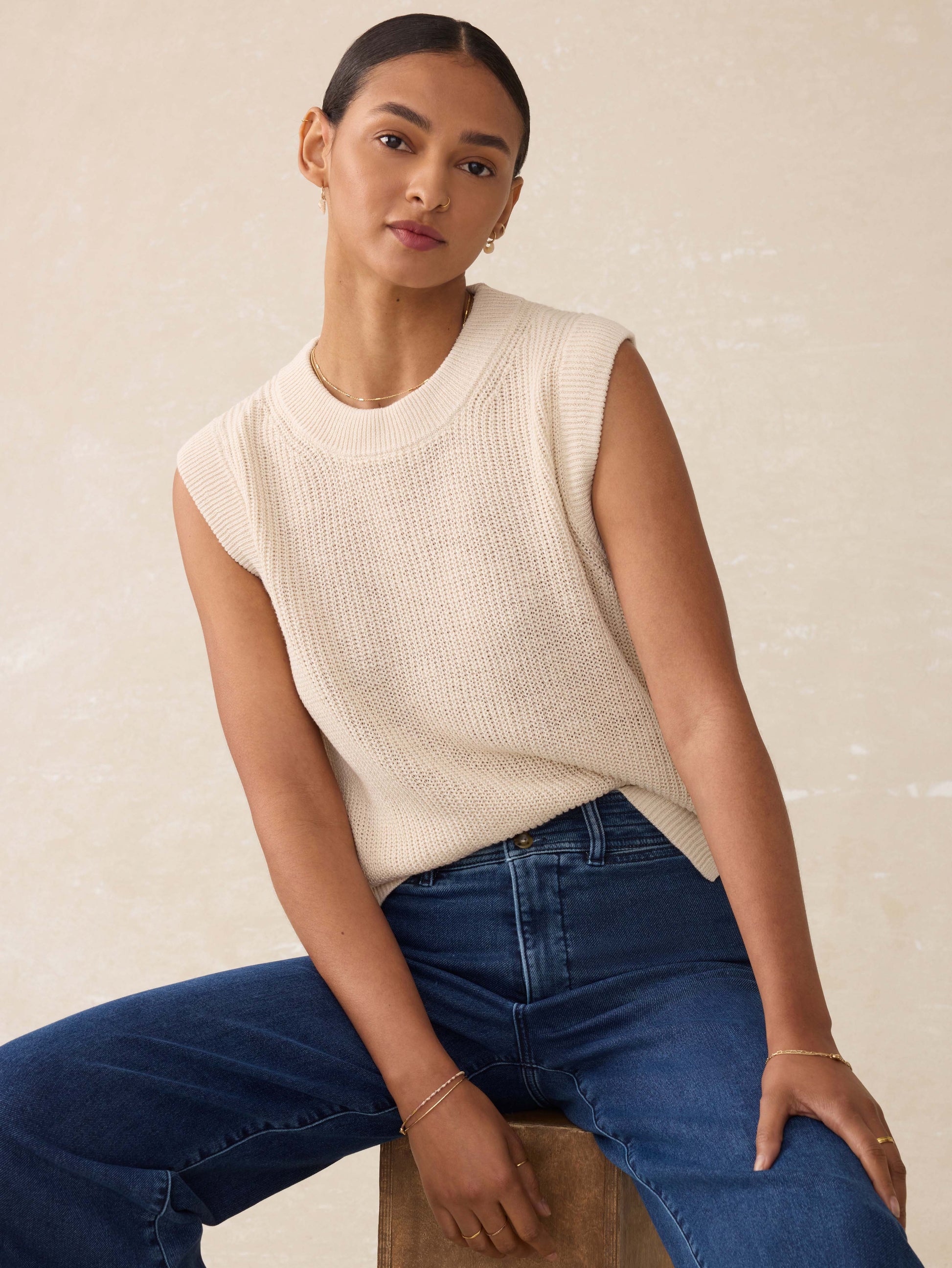 - Detail: Sleeveless crewneck tank with side slits. Loosely knit half cardigan stitch. Rib trims at neckline, armhole and bottom hem.