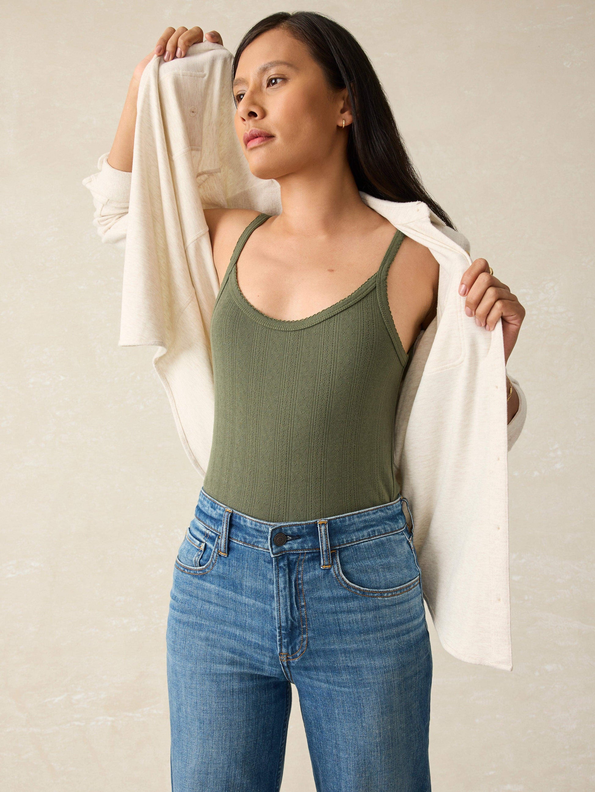 • Detail: Camisole tank with pique rib trim detail.