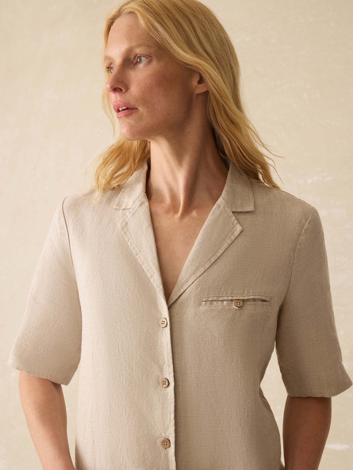 The polish of a shirtdress with the lounge-like comfort of a caftan, this linen dress is your ultimate warm-weather staple. Crafted from lightweight, breathable linen, it drapes beautifully for a relaxed yet refined silhouette. It transitions effortlessly from beach days to dinner outings.