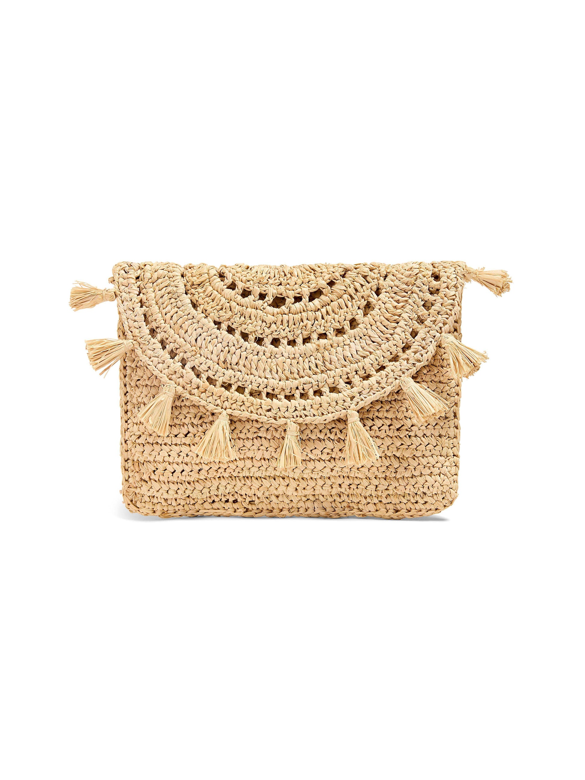 Playful tassel trim gives this hand-crocheted raffia bag a fun-in-the-sun attitude whether you wear it crossbody for day trips or as a clutch for summer weddings.