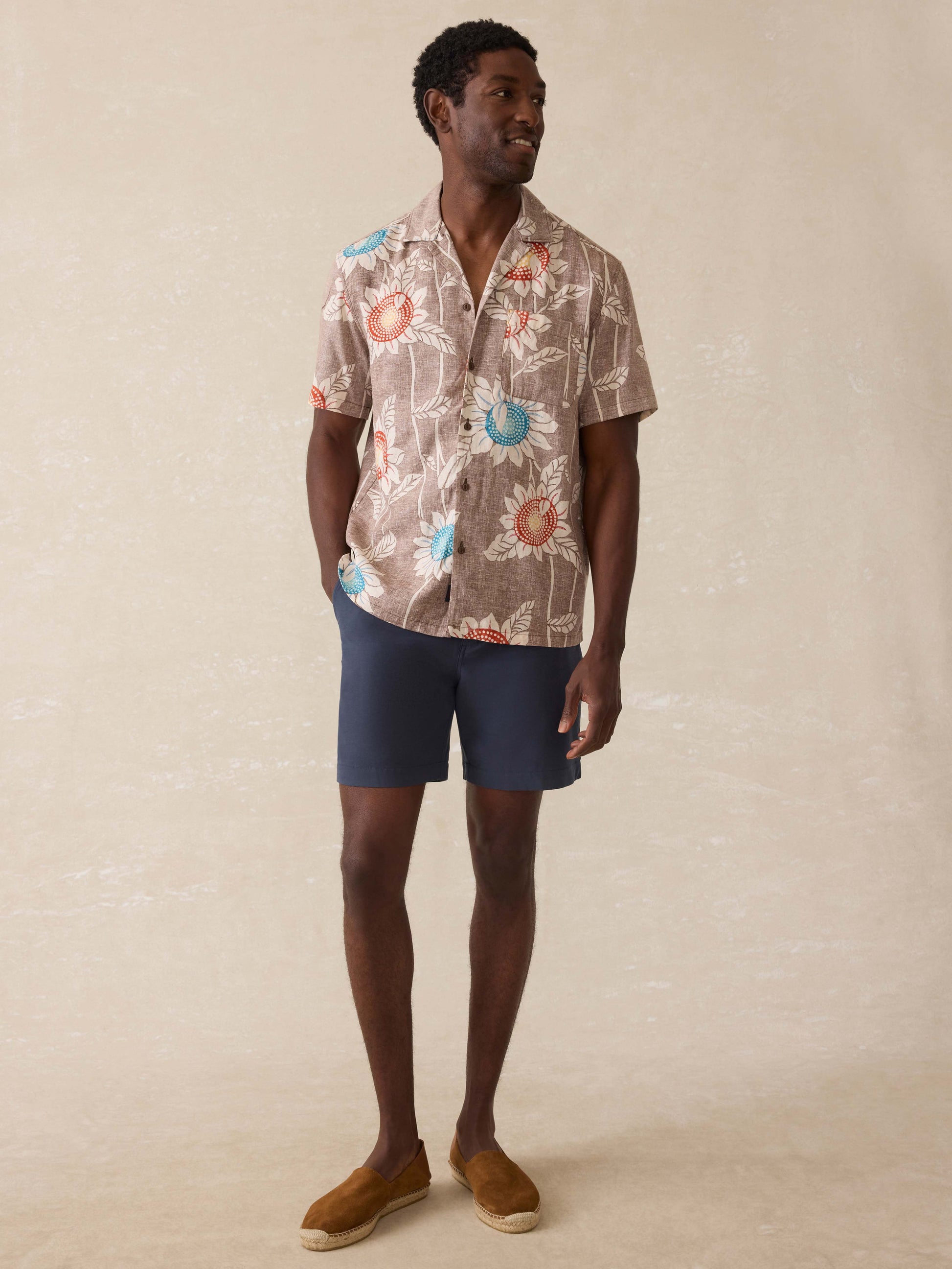 For sun-drenched days, we crafted this shirt from a super soft custom fabrication made primarily from linen. Lightweight with a bit of stretch, its unique hand feel gives our signature travel-inspired prints an added natural texture. Wear it whenever you're seeking those effortless vacation vibes.