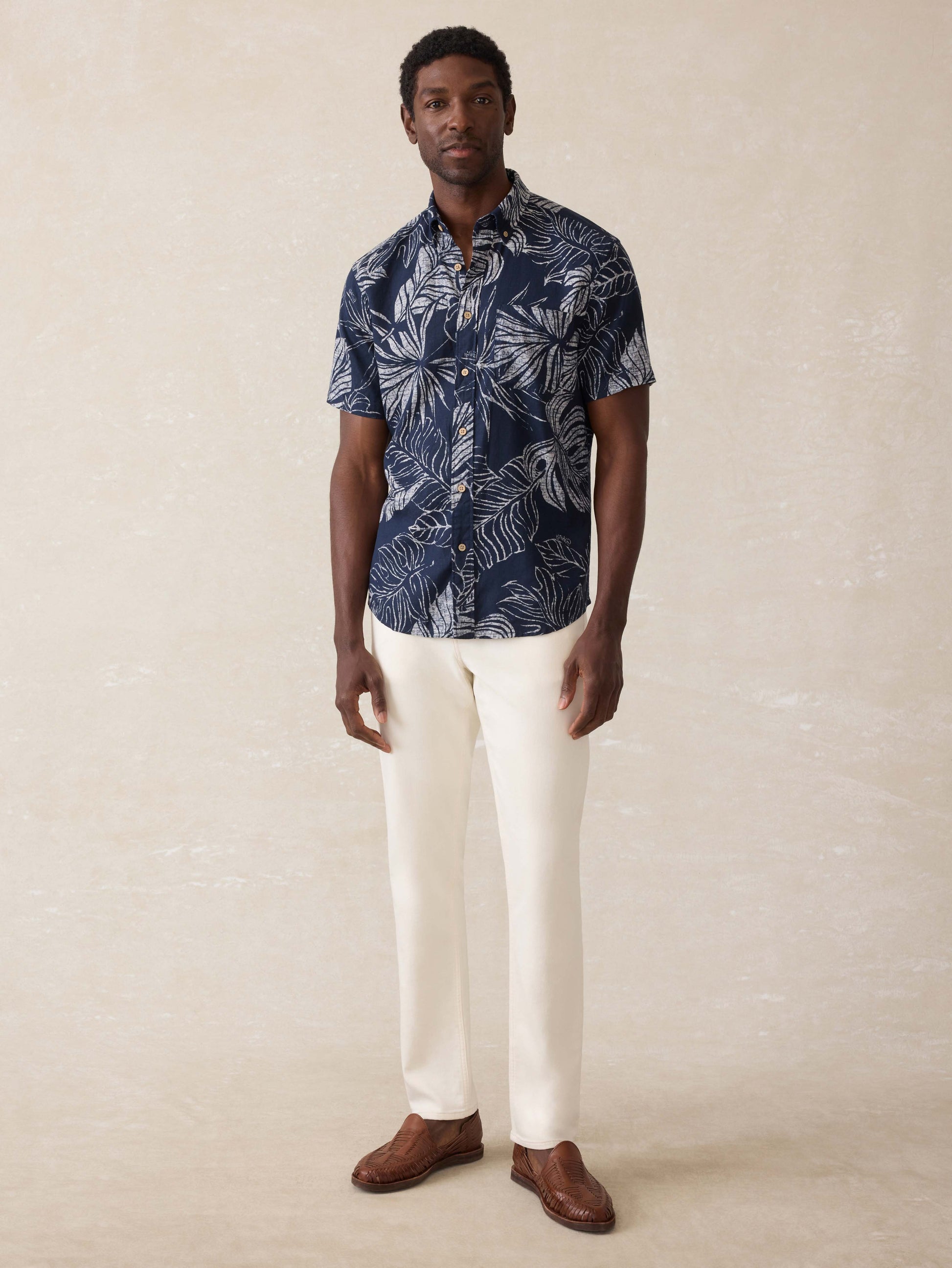 For sun-drenched days, we crafted this shirt from a super soft custom fabrication made primarily from linen. Lightweight with a bit of stretch, its unique hand feel gives our signature travel-inspired prints an added natural texture. Wear it whenever you're seeking those effortless vacation vibes.