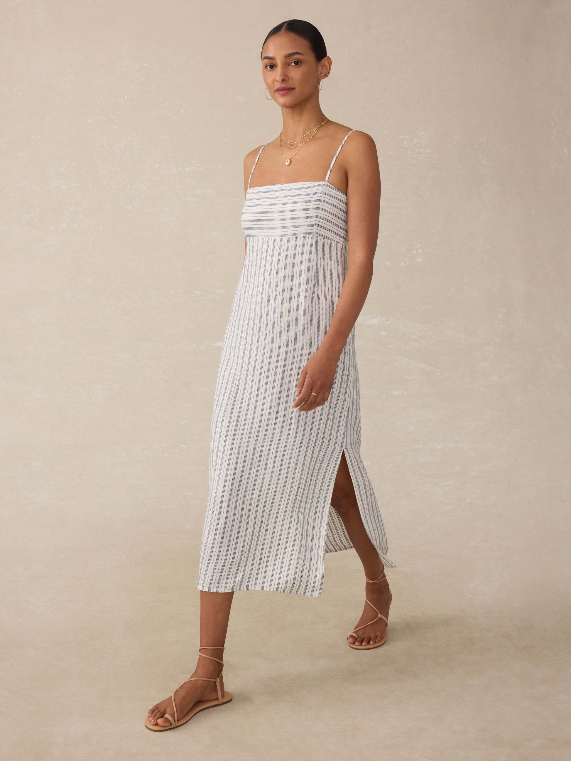 A summer-ready, whimsical stripe adorns this timeless dress that brims with everyday ease but is perfectly suited for any special occasion. Thoughtfully designed with a beautifully textured linen blend in a low-key figure skimming fit, dressing up should always be this effortless.