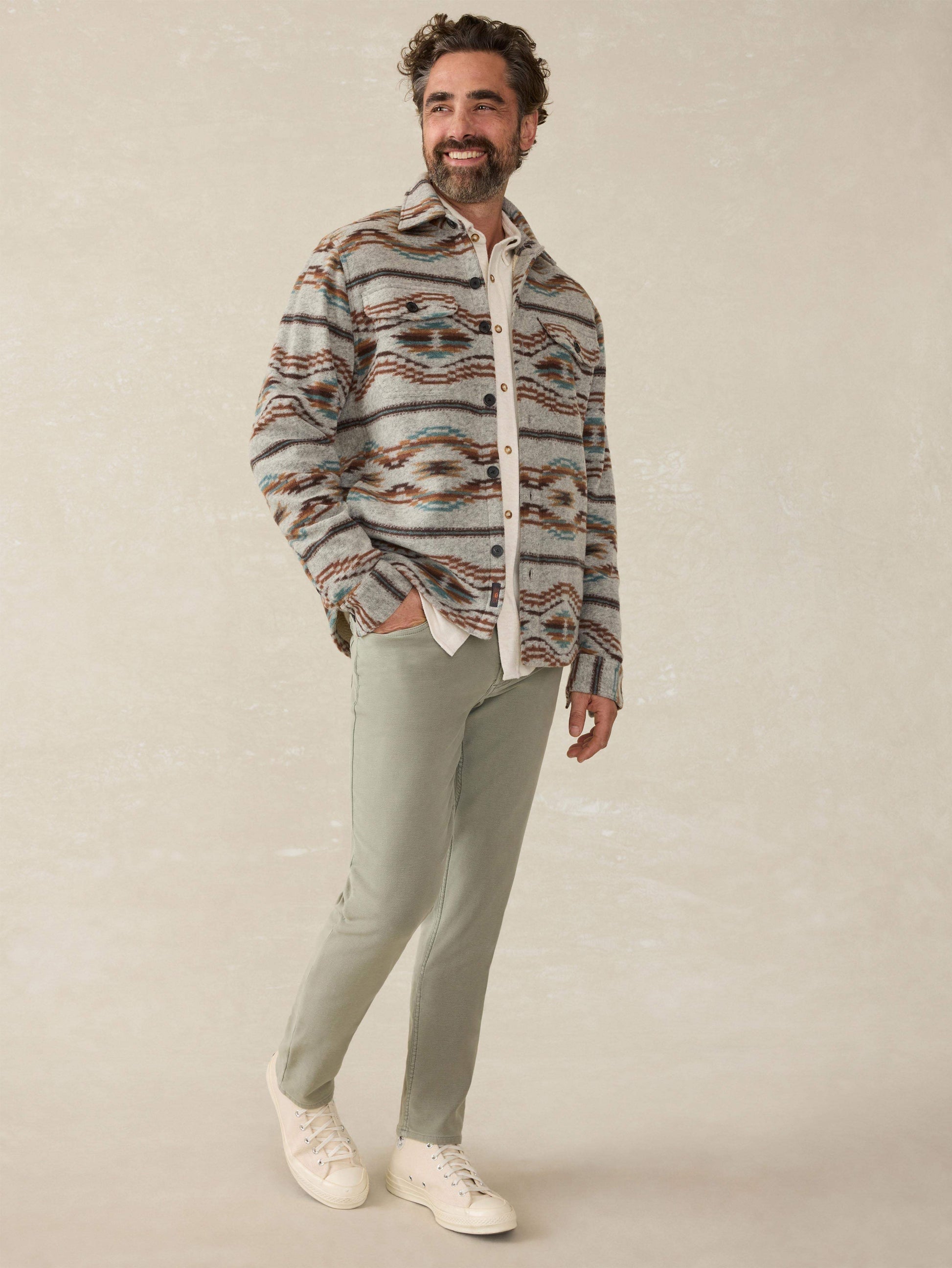 - Detail: Belt loops. Classic 5-pocket styling. Metal Rivets for pocket reinforcements. Metal fly zipper. Faherty logo back patch at wearer's right.