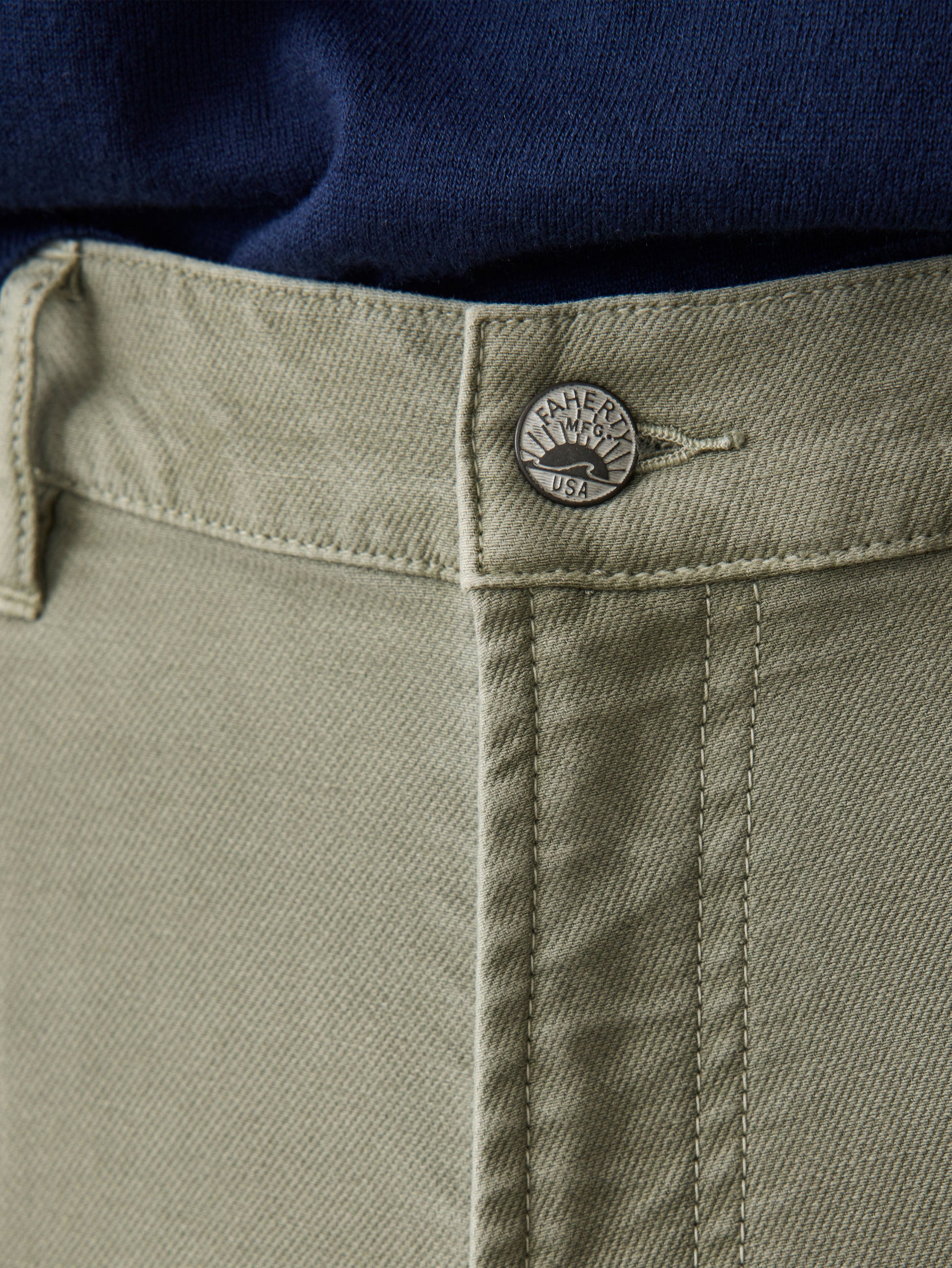 - Detail: Classic 5-pocket Pant. Metal shank and fly zipper opening. Faherty logo back patch at wearer's right.
