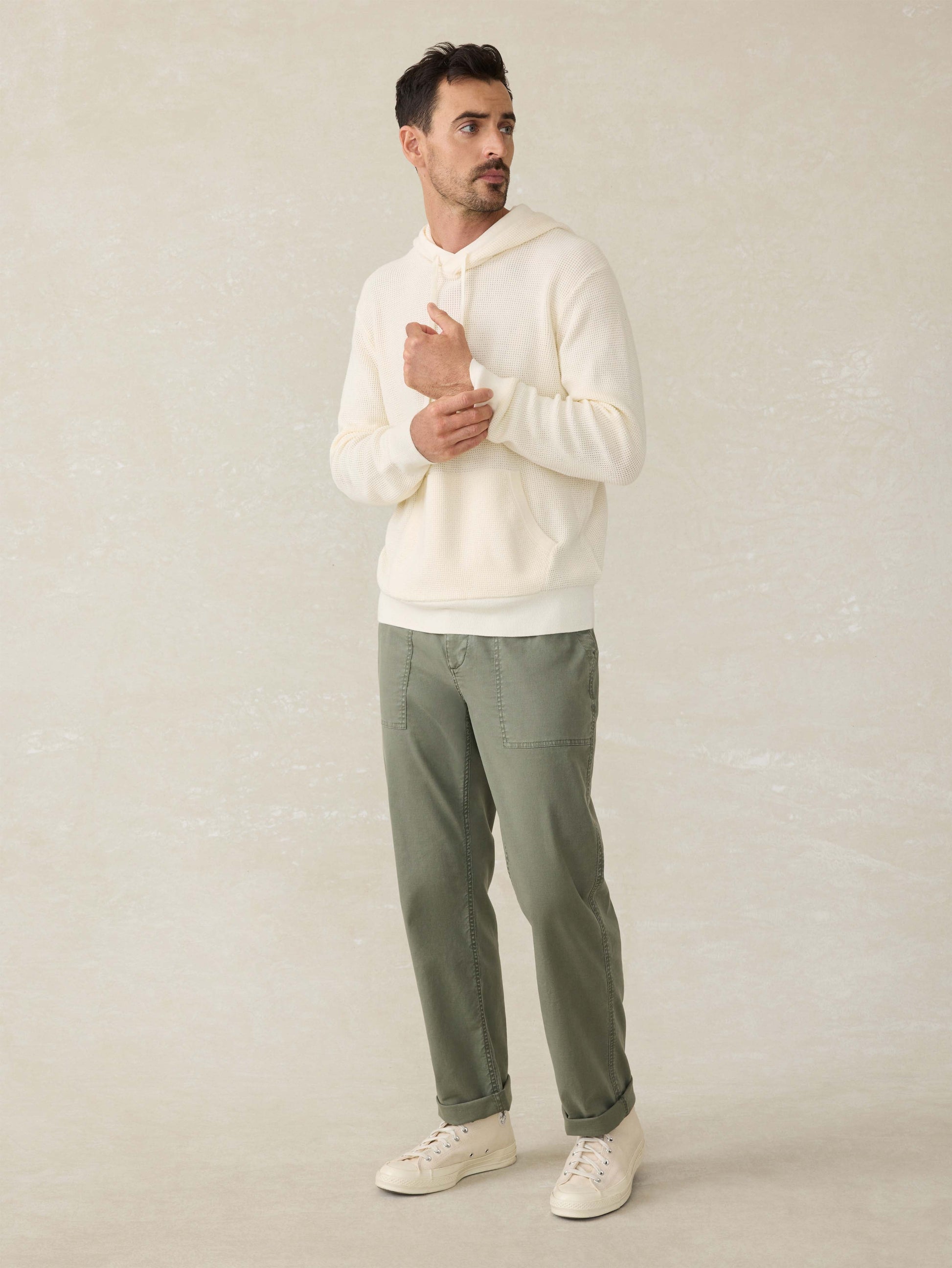 Designed as an easy-to-wear, transitional layer, this hoodie will be in your rotation all year round. Our cotton yarn is super soft but not overly warm and knit in an airy, waffle stitch giving the sweater dimension and texture. It's then garment-dyed and washed for a lived-in, look and feel.