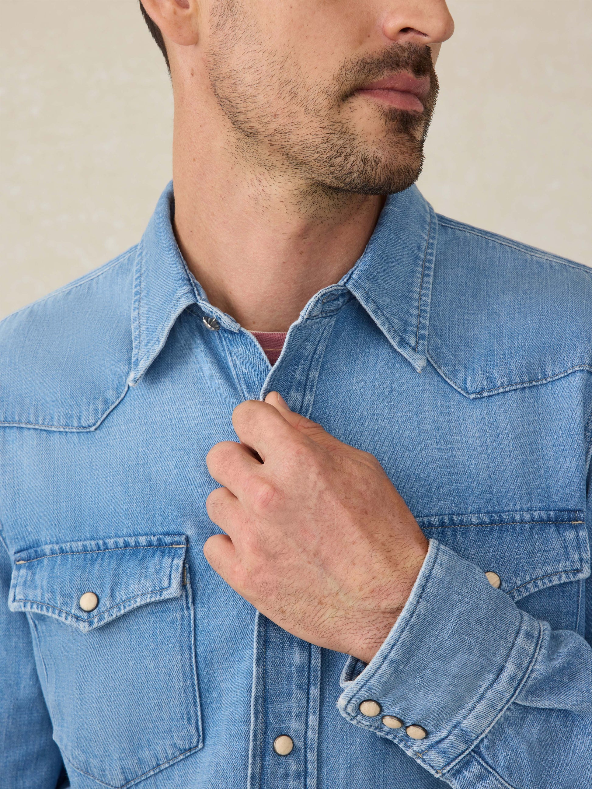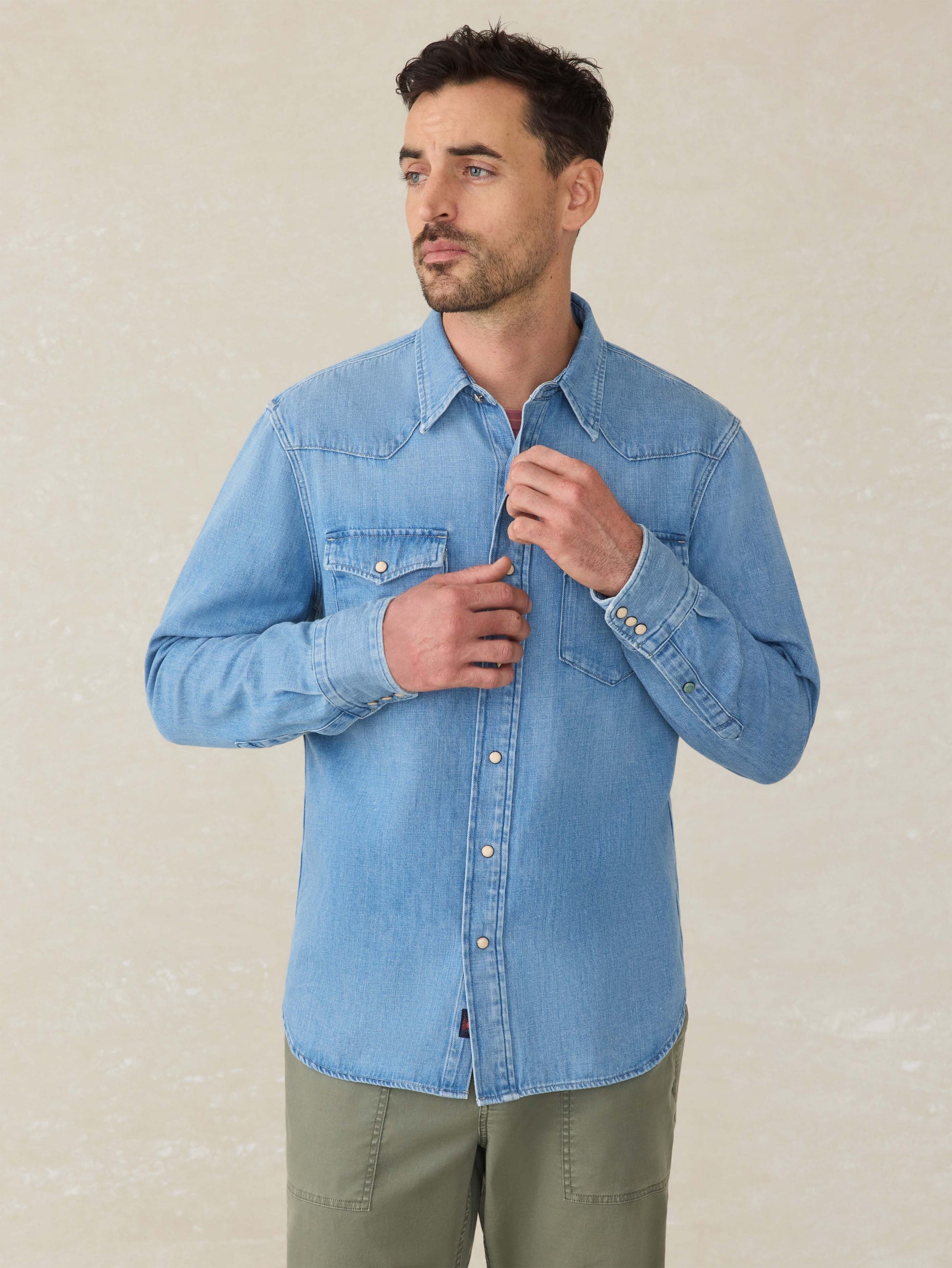 • Detail: Classic western shirt silhouette with a traditional western shirt pointed collar, V-shaped yoke on the front and back, snap button closures, two chest pockets with flaps, and curved shirt tail hem. Faux cream stone snaps at the CF plackets and cuffs, except for the accent faux turquoise snaps at the sleeve plackets. Fabric is light weight denim that’s loosely woven with irregular slub yarns, giving you the light, airy soft hand feel. faded light indigo wash.