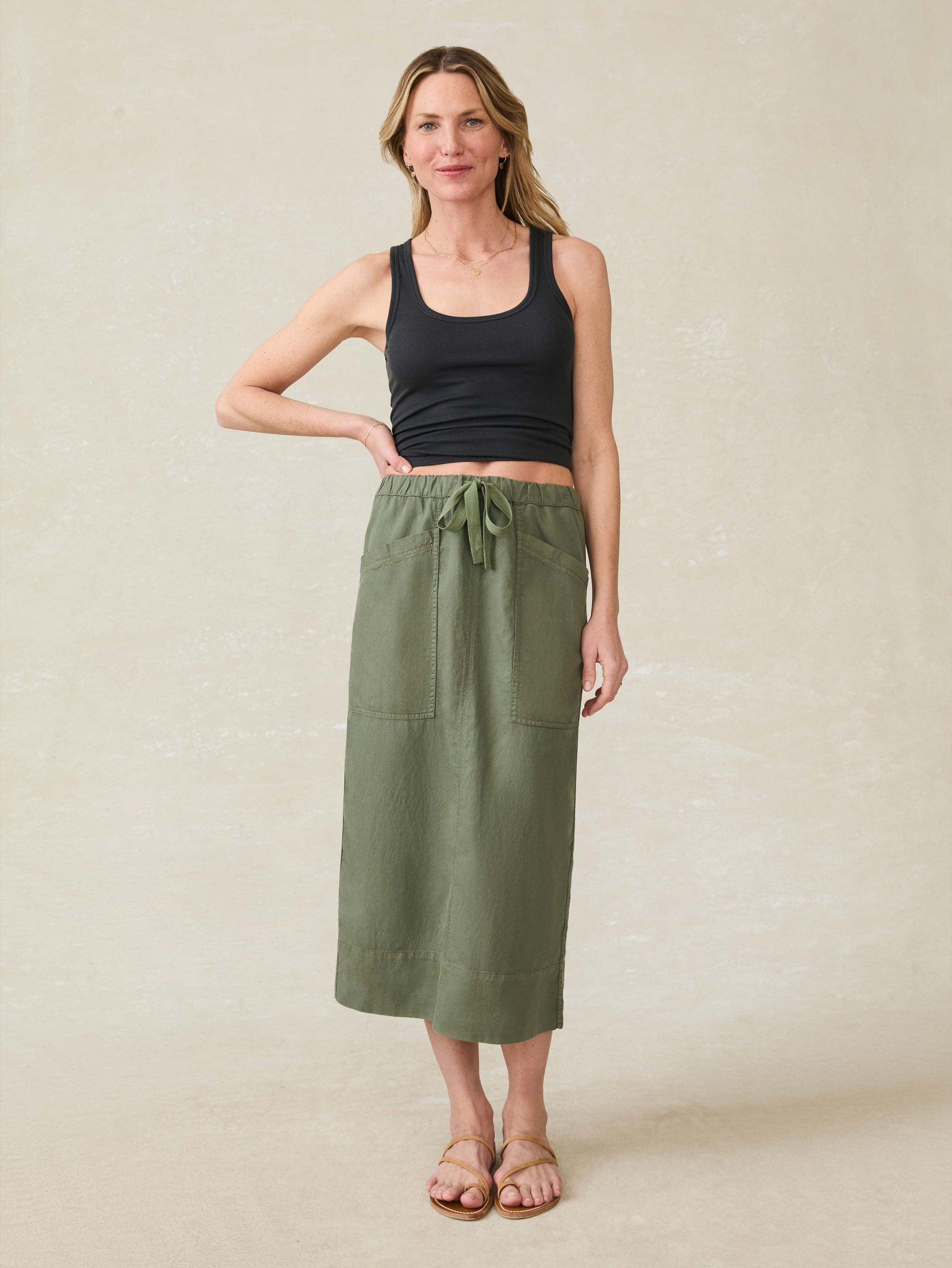 This utility skirt is your new work to weekend essential, effortlessly merging rugged style with a touch of heritage craftsmanship. Made from Faherty's special recipe of linen, organic cotton, and Tencel, it offers a unique blend of softness and durability that keeps getting better with every wear. With practical patch pockets for a laid-back vibe and a center-back slit that ensures ease of movement