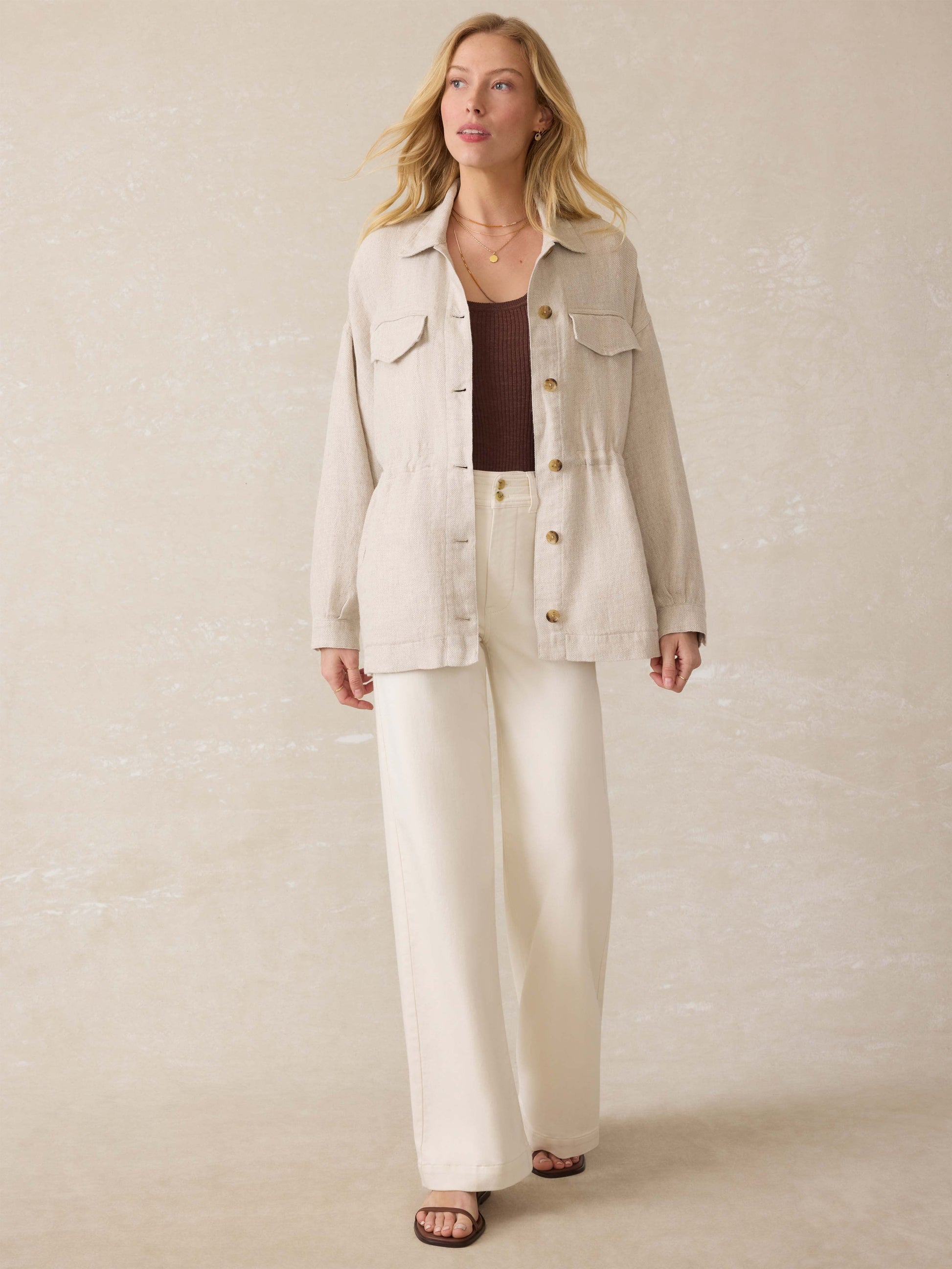 Designed with intention, this twill linen utility jacket brings together structure, softness, and laid-back polish. Front flap and welt pockets offer function and a touch of vintage-inspired style, while the drawcord waist lets you cinch it in for a more defined shape.